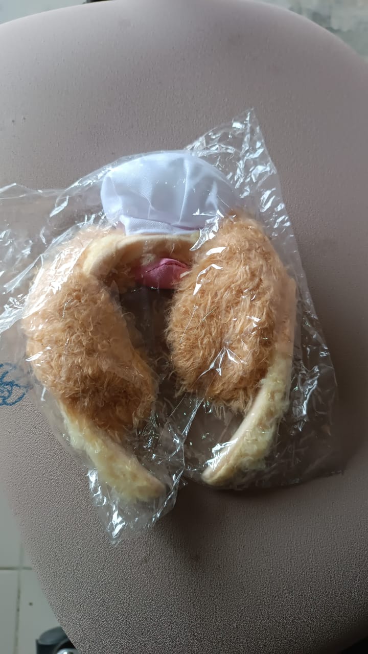 Designed with floppy animal-style ears, a chef cap, and a bright bow