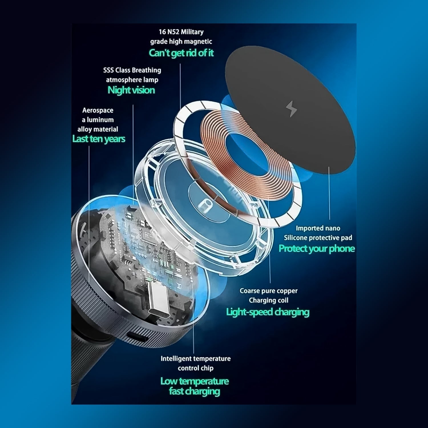 - Safe and Powerful Magnets - What sets for Magnetic Phone Mount Wireless Charger apart is its powerful and safe magnets. With strong magnetic force, your phone stays secure even on the bumpiest roads, giving you peace of mind while you drive. This car cell phone holder is compatible with iPhone and allows for quick mounting without the use of clamps. Upgrade your car accessories with where safety and functionality meet entertainment.